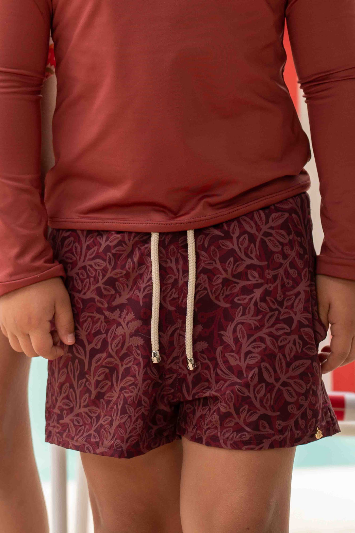 Estampado en tonos vino y terracota con ilustraciones botánicas que evocan hojas, ramas y flores, pensado para armonizar con el resto de la colección Tropical.