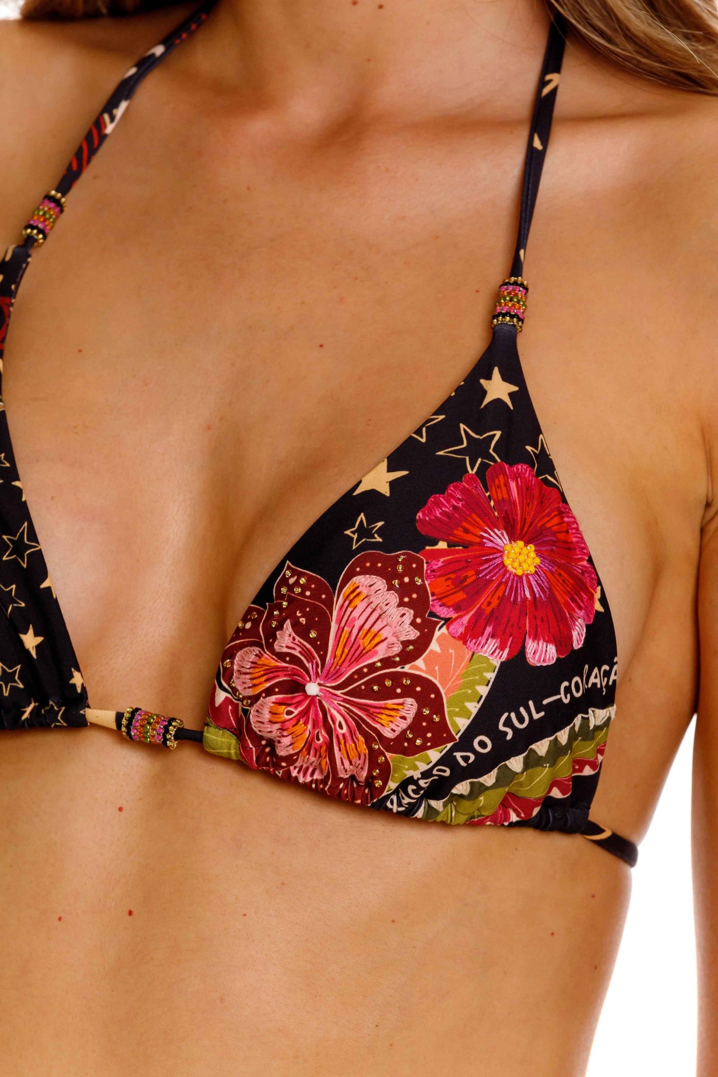 Detalles elaborados a mano en el centro del busto y en las tiras, que evocan tradición y color latinoamericano. Un toque único que diferencia la pieza.