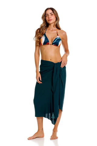 mide 1,77 m y usa el pareo en combinación con el bikini Nebula Verde, mostrando su versatilidad y estilo envolvente.
