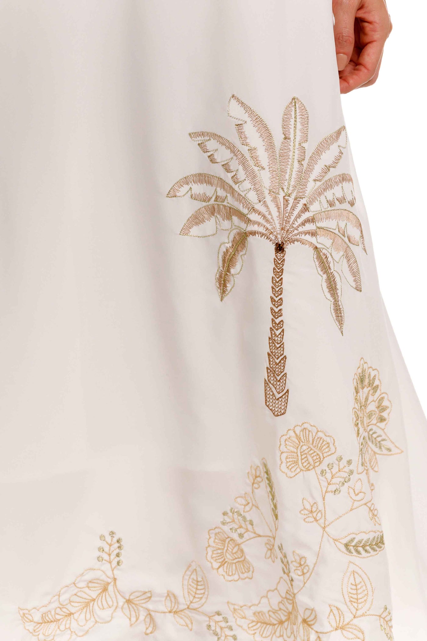 Palmera y flora tropical bordadas a mano en hilo crudo y dorado claro. Un guiño artesanal que eleva la prenda con detalles exclusivos inspirados en el paisaje caribeño.